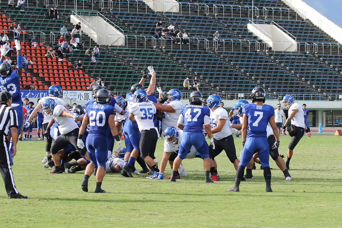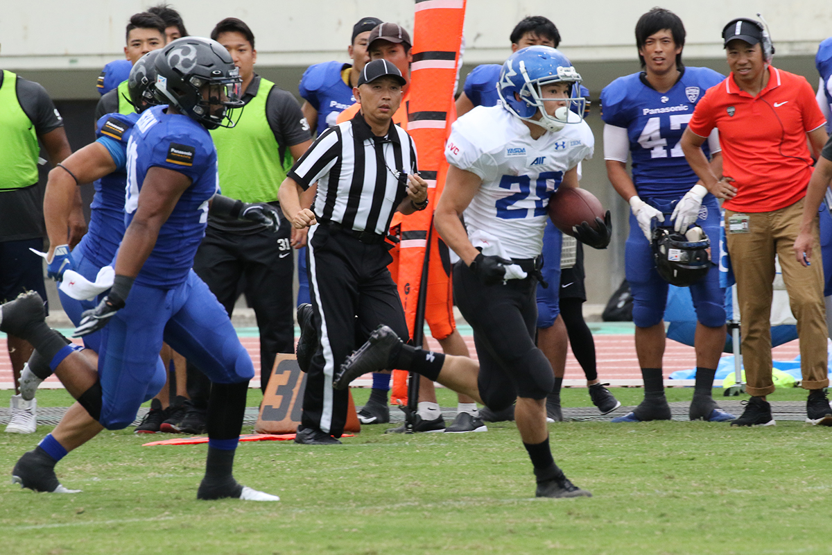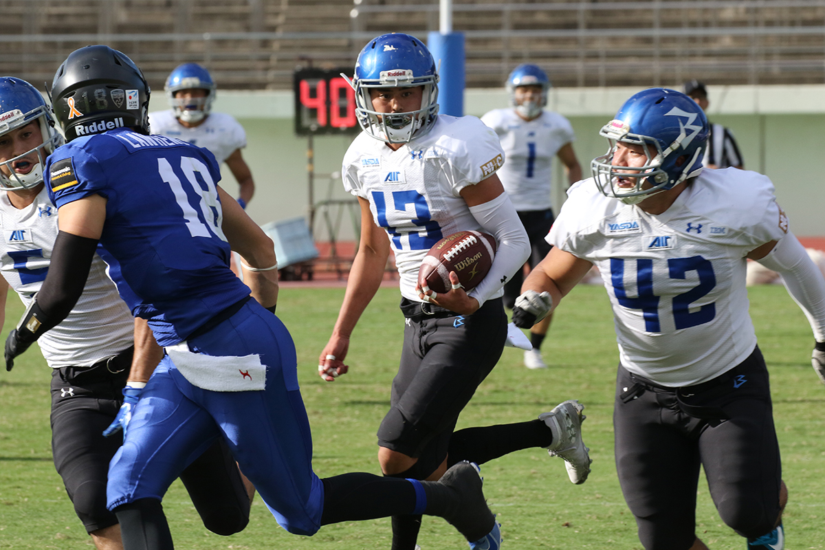 ディフェンスとして最も注意しなければならないのは、QB#19ソコール選手のパスとランです。前節のオール三菱戦では、スクランブルも含めて86ヤードと試合でのリーディングラッシャーを記録しており、BigBlueのDL/LB陣としては、パスポケットを絞り込み、投げさせないことは勿論、ポケットから出る前にタックルをして押さえたいところです。パナソニック戦では、焦りもあったのかタックルをミスしたり、タックルを交わされてそこからロングゲインを許す場面が何度もありましたが、この試合では確実に相手の足を止める堅実なプレーが要求されます。また、ランプレーでは、今シーズンLIXILディアーズ(以下、LIXIL)から移籍したRB#44白神選手も注意が必要です。LIXIL時代にも、その突破力とスクリメージラインを抜けてからの走力に翻弄されましたが、この試合でも注意が必要です。