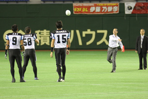 コイントスの前には「オレンジリボンキャンペーン」のセレモニーが行われました。 「オレンジリボンキャンペーン」とは、子供への虐待防止を目的とした運動です。Xリーグはこのキャンペーンに賛同し、今シーズンの開幕戦でオレンジリボン キャンペーンの啓蒙活動をお手伝いしました。試合前のセレモニーでは、東京都福祉保健局長 安藤立美様が記念ボールを両チームのキャプテンに見事なスロー で始球式を行い、またコインのトスアップもされ、スタンドから大きな拍手を受けておられました。この結果、BigBlueのキックオフで今シーズンがス タートします。