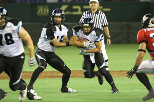 続くBigBlueのシリーズもパントで交替。富士通のオフェンスシリーズが始まり、WR#17秋山へのパスが決まりランアフターキャッチで一気に ゴール前に突進されます。しかし、ここでDB#9阿部のタックルがボールを叩きファンブル。これをリカバリーして一気に攻守交代となります。ゴール前2 ヤードからの厳しいオフェンスですが、RB#30工藤のランで陣地を回復しダウンを更新。このまま一気に攻め込みたいところですが、富士通の厳しいディ フェンスを破ることが出来ず、このシリーズもパントで終わってしまいます。残り2分からの富士通の攻撃。ランプレーで前進を許し、さらに反則で相手に前進 を許し、最後は再び#15プレナンに9ヤードTDパスが決まり、点差はさらに0-21に広がります。
