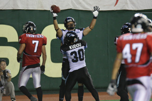 厳 しい試合になる事は予想していたものの、予想以上に厳しい内容になった前半。3TD差を追いかけるためにも、早くTDが欲しいBigBlueのオフェンス シリーズで3Qは始まります。WR#17小川へのパスは通ったものの、反則で無効に。やや落ち込んだものの、次のプレーではWR#7福井に25ヤードのロ ングパスが通り敵陣に入ります。さらに3rdダウンロングの状況から、再び#44天谷に19ヤードのパスが決まり、一気にゴール前に。ベテランの活躍に大 いに盛り上がります。このチャンスに、最後は#17小川に5ヤードTDパスが通り、7分以上もの長いドライブの末待望の得点がBigBlueに入ります。
