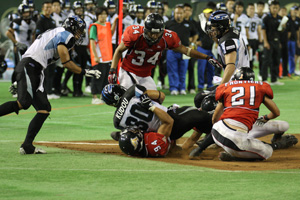 この勢いを何とかつなぎ止めたいBigBlue。しかし富士通もこの日好調なランプレーを中心にBigBlueディフェンスを苦しめます。ゴール前 14ヤードで3rdダウン残り2ヤード。ここでLB#56原のハードタックルで、ファーストダウンを狙ったRB#30金の突進をロスタックルで止めたとこ ろで3Qが終了しサイドが入れ替わります。