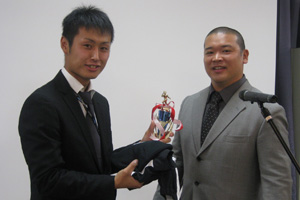 TEAM MVPを松崎部長から受け取る#3サンプル選手 サンプル選手はKicking of the Yearも合わせて受賞 |
